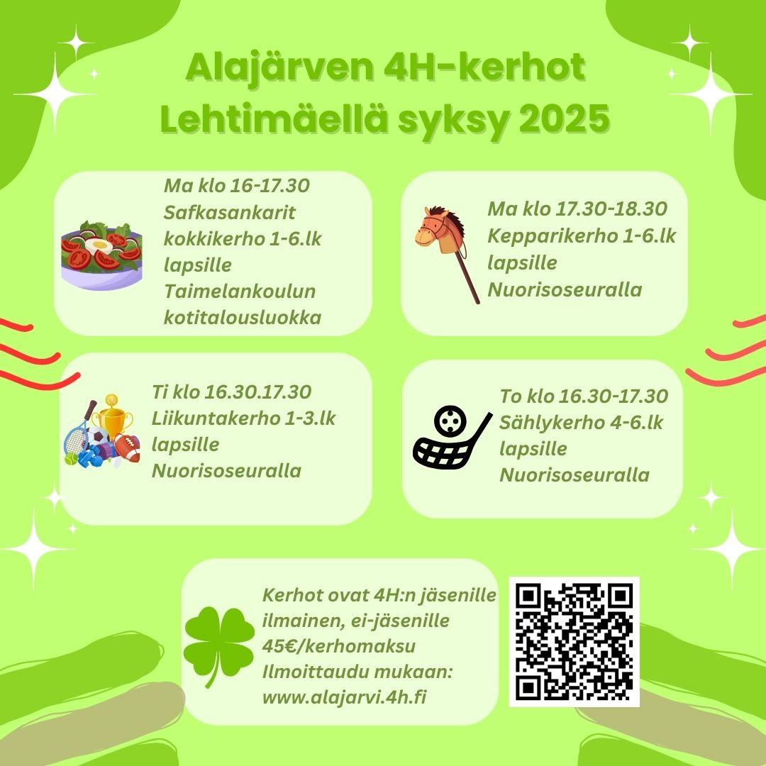 4H-jäsenmaksu 45€/hlö/vuosi tai 90€/perhe/vuosi.Jäsenenä voit osallistua Alajärven 4H-yhdistyksen monipuoliseen toimintaan ympäri vuoden.