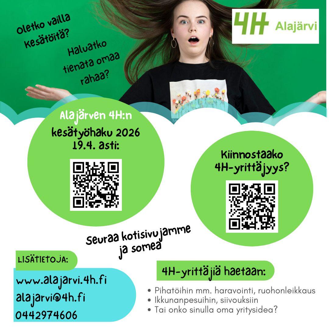 Alajärven 4H:n kerhokausi alkaa. 4H-kerhoja pidetään: - 4H-kellarilla Alajärvellä - Lehtimäen Nuorisoseuralla ja Taimelan koululla - Soinin Yhtenäiskoululla Ilmoittaudu mukaan täältä