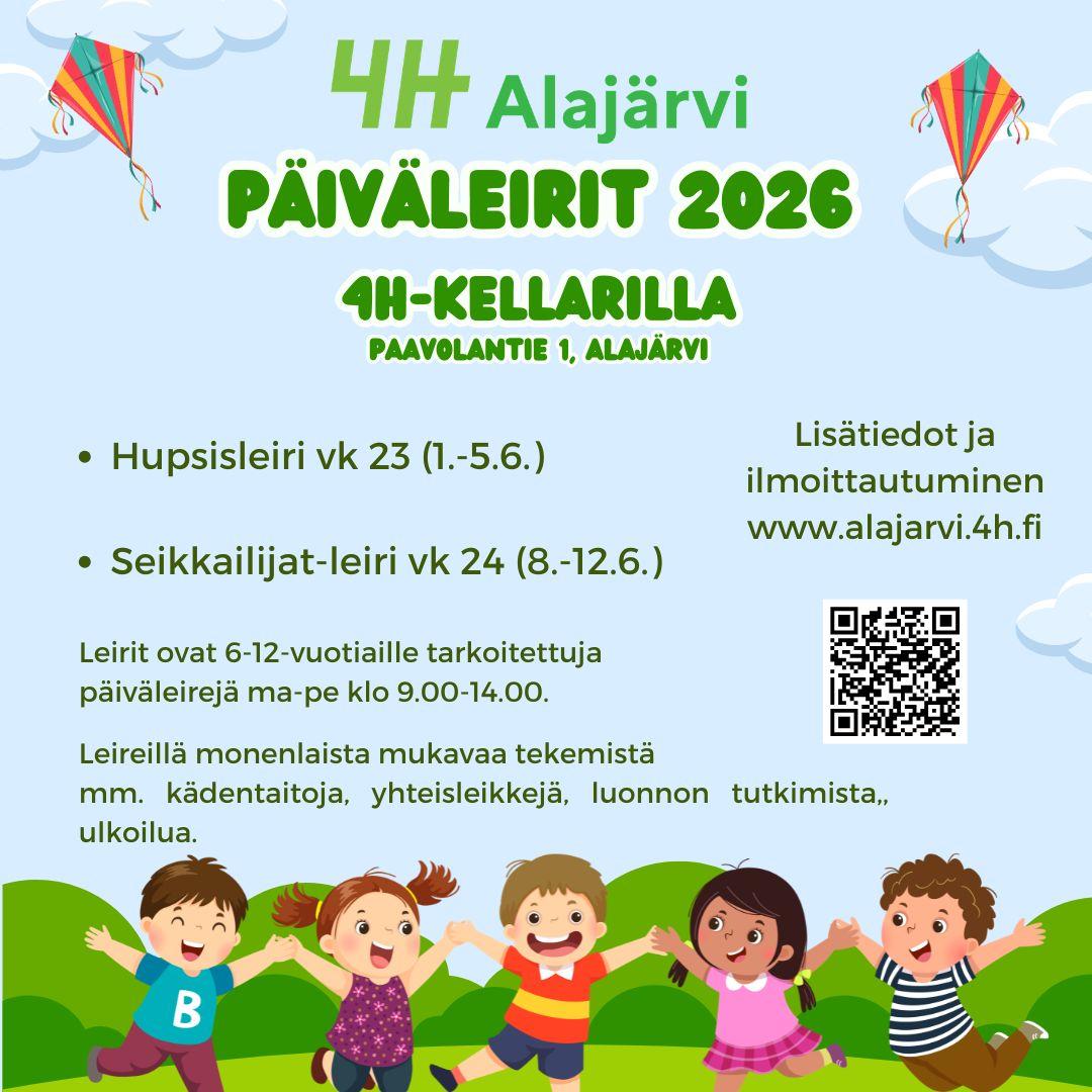 SEIKKAILIJAT-LEIRI 8.-12.6.2026 Leiri järjstetään 4H-kellarilla Alajärvellä (Paavolantie 1). Leiri kestää maanantaista perjantaihin, päivittäin klo 9.00-14.00. Leiri on tarkoitettu 6-12-vuotiaille.…