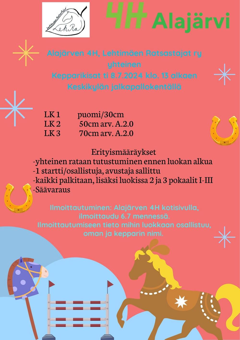 Alajärven 4H ja Lehtimäen Ratsastajat ry järjestää yhdessä perinteisesti Lehtimäen Ränkiviikolla tiistaina 8.7.2025 Kepparikisat keskikylässä jalkapallokentällä. Kissat alkavat klo. 13.00 ja päättyy…