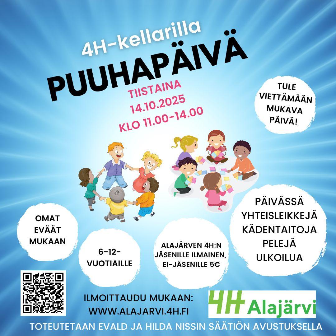Syysloman Puuhapäivä 4H-kellarilla tiistaina 14.10. klo 11-14. Omat eväät mukaan. Alajärven 4H:n jäsenille ilmainen, ei-jäseniltä 5€. ENNAKKOILMOITTAUTUMINEN alla olevalla lomakkeella.