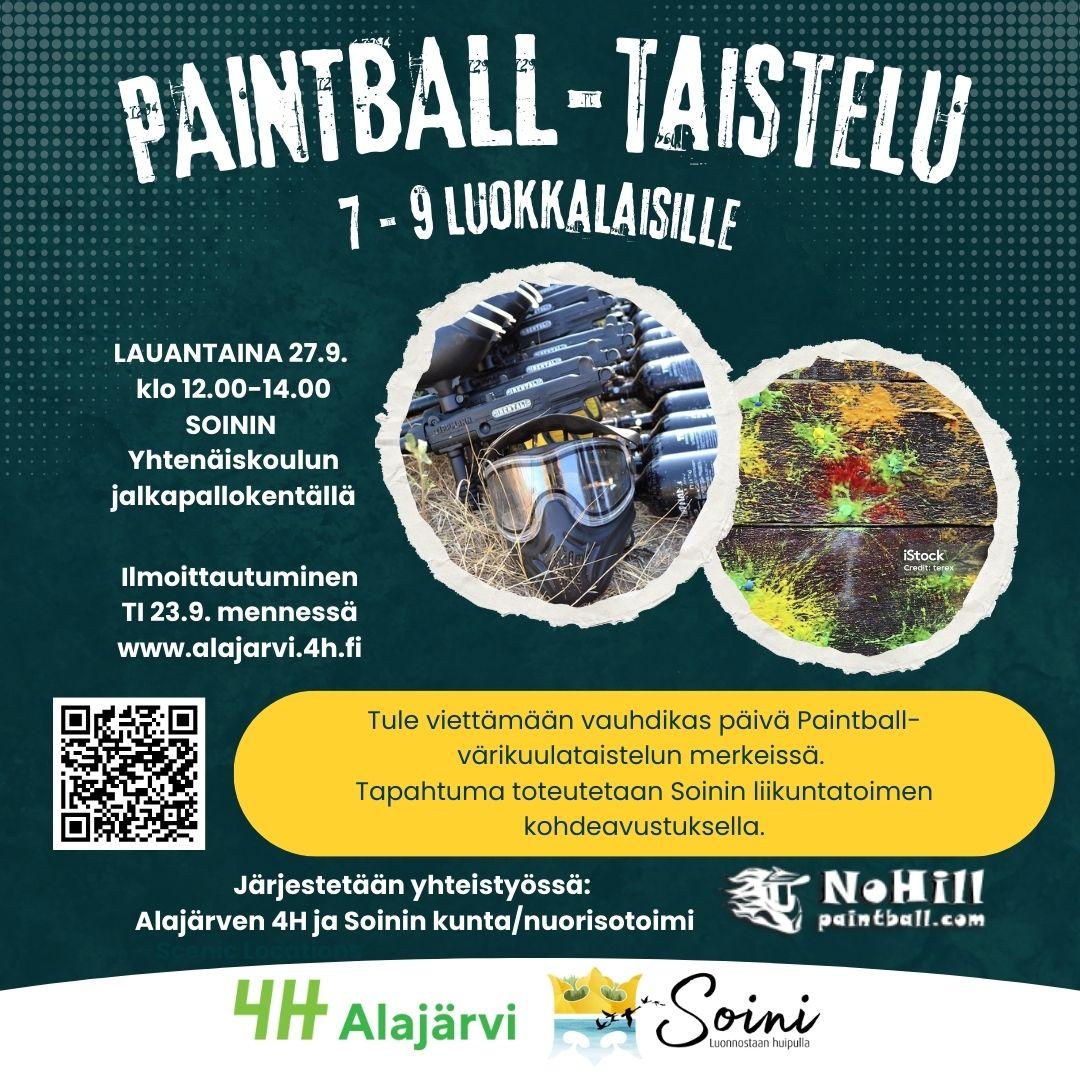 Paintball-taistelu soinilaisille 7-9 luokkalaisille lauantaina 27.9. klo 12.00-14.00. Ilmoittaudu alla olevalla lomakkeella tiistaihin 23.9. mennessä.